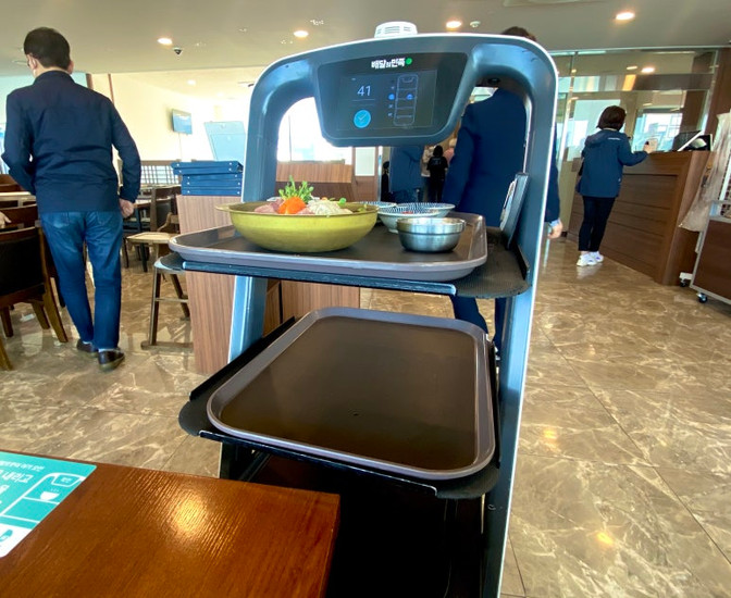 Eventually, I was awkwardly seated alone at a four-person table and ordered a single bowl of mulhoe. Instead of being served in the usual way, the dishes were brought out by robots. I found myself saying thank you to the robots and carrying my food and side dishes myself, which felt both a little pitiful and funny at the same time. So many random emotions hit me in that moment.