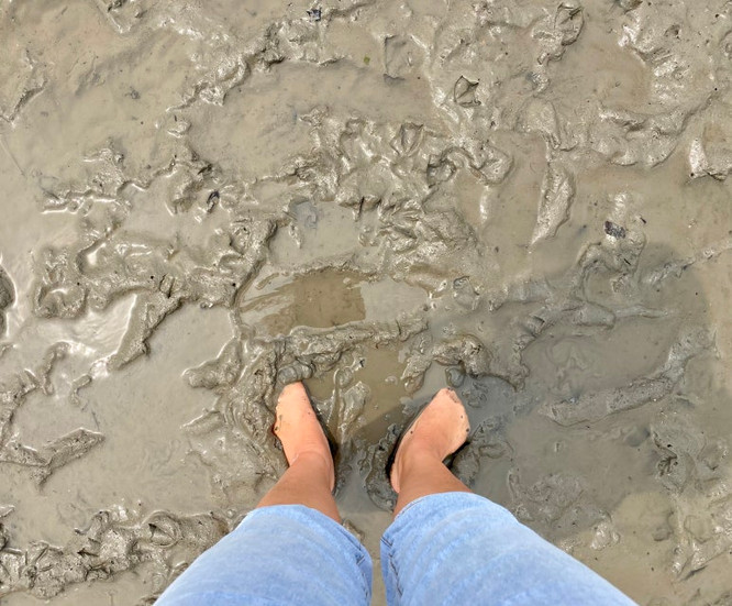 Excited to see the wide mudflats again after such a long time, I kicked off my shoes and socks and ran straight in. Standing alone in the middle of the tidal flats, I smeared mud all over myself like a kid, playing with the textures and feeling as if I had returned to my childhood.